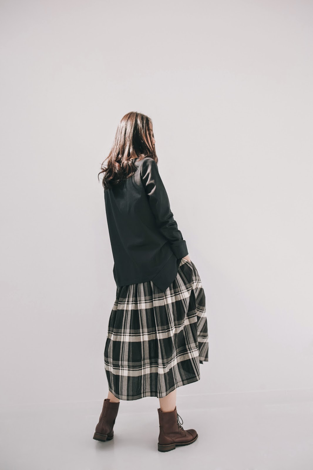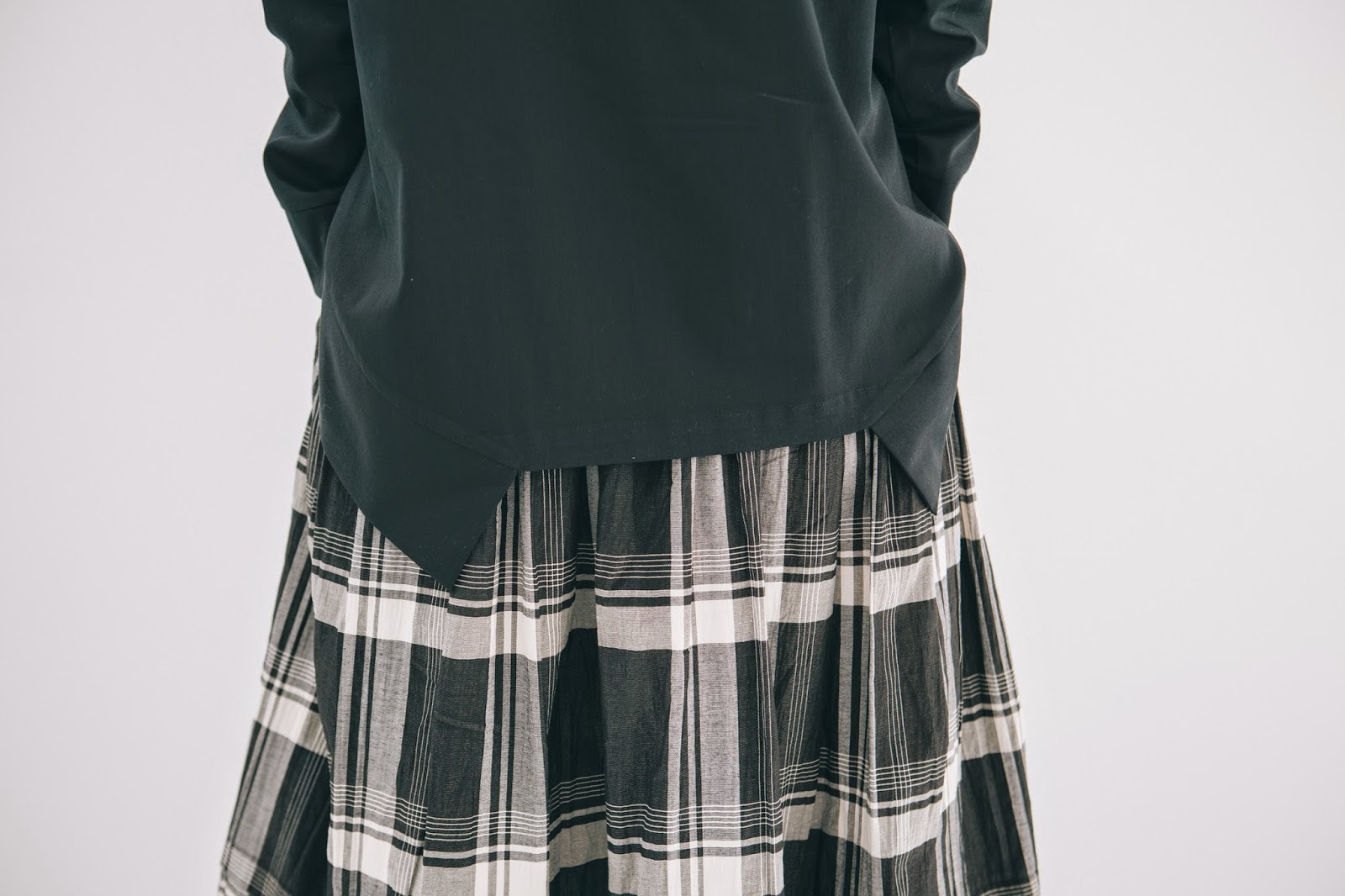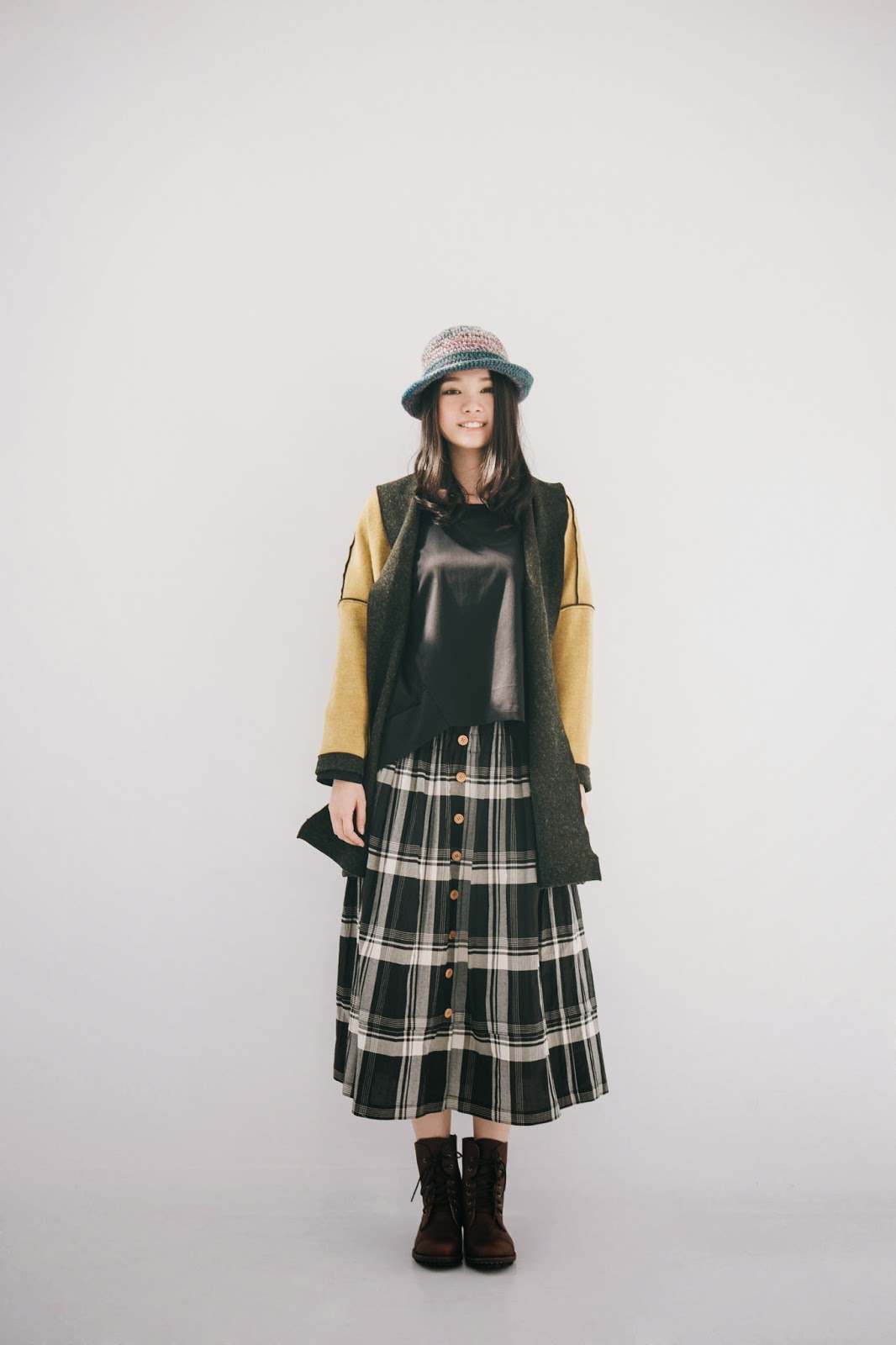 新品上衣搭配上這件長長的木釦格紋裙