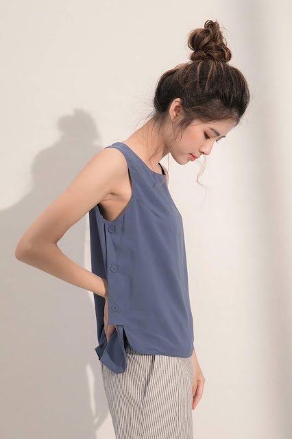 夏夜晚風無袖側釦上衣-湖色月光 $1480