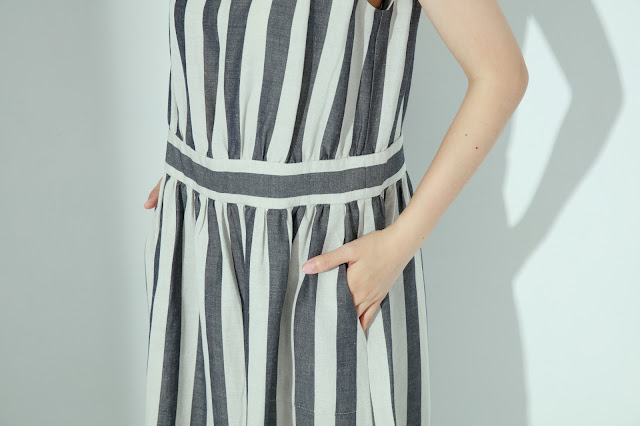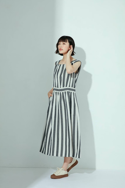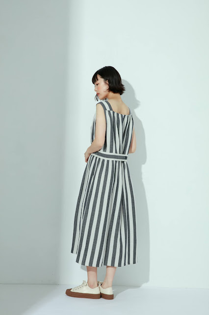 夏艾條紋輕軟寬肩洋裝-炭橡 $3280