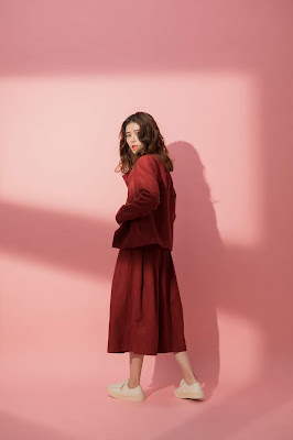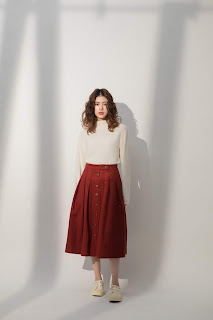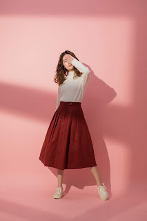 白色上衣X酒紅色下身裙X白色餅乾鞋