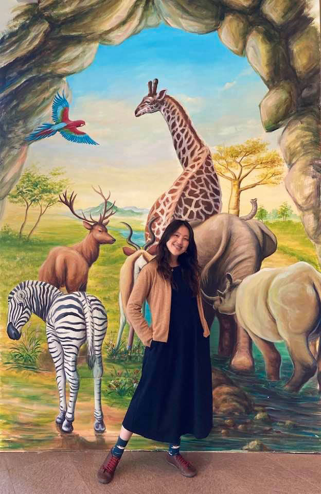 在動物背景圖中的照片呈現出洋裝的優雅自在