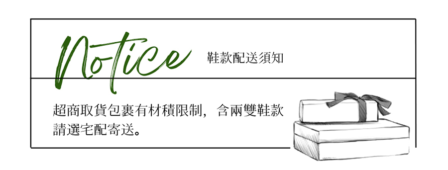 ・超商取貨包裹有材積限制,含兩雙鞋款請選宅配寄送。